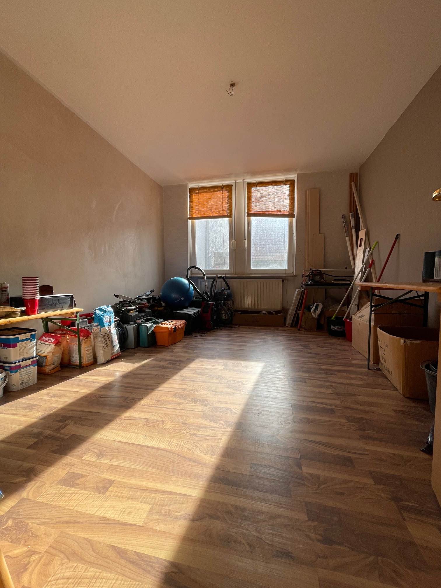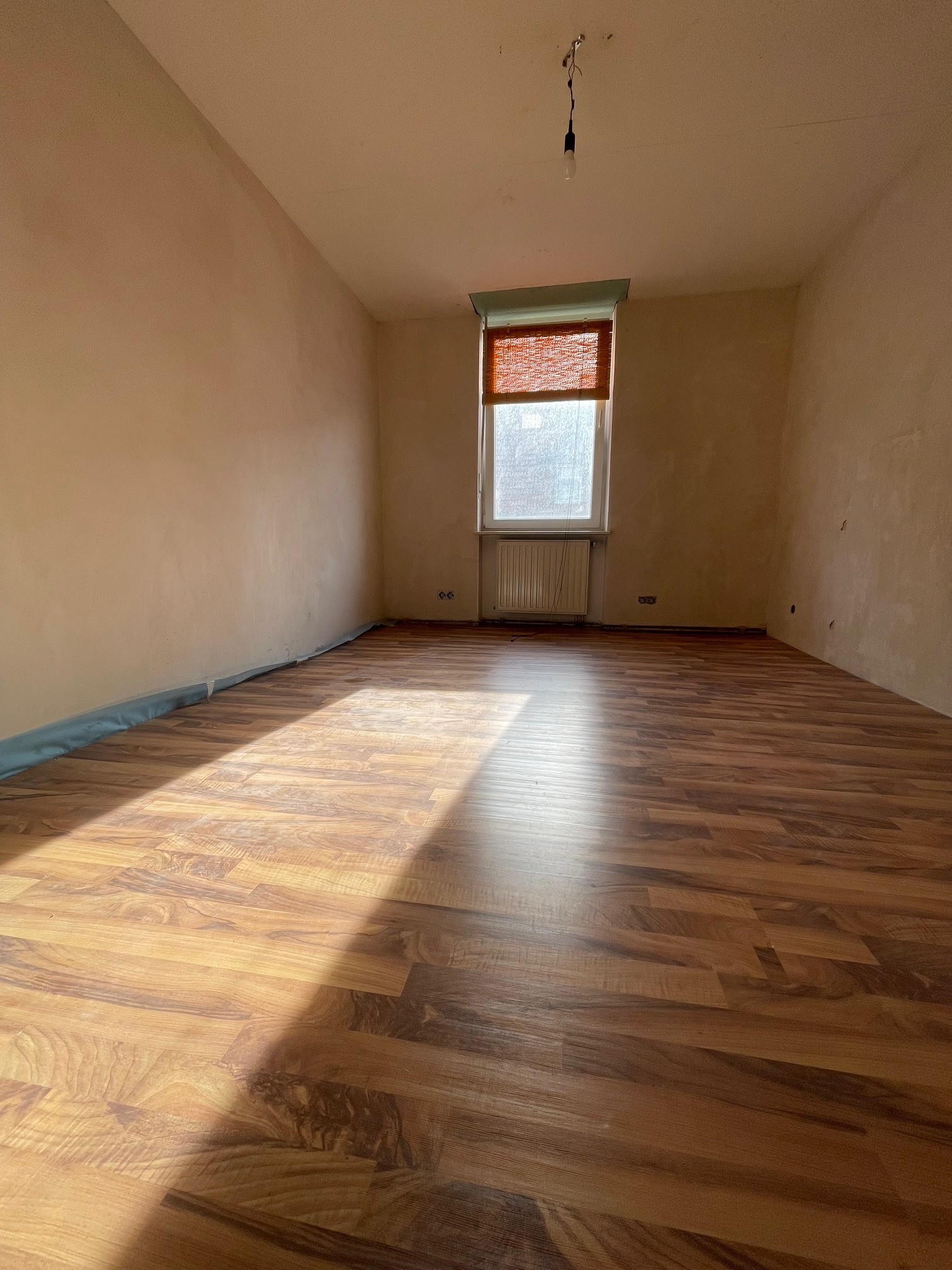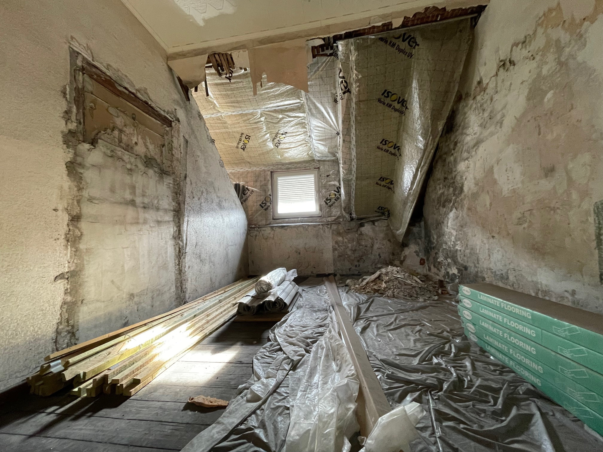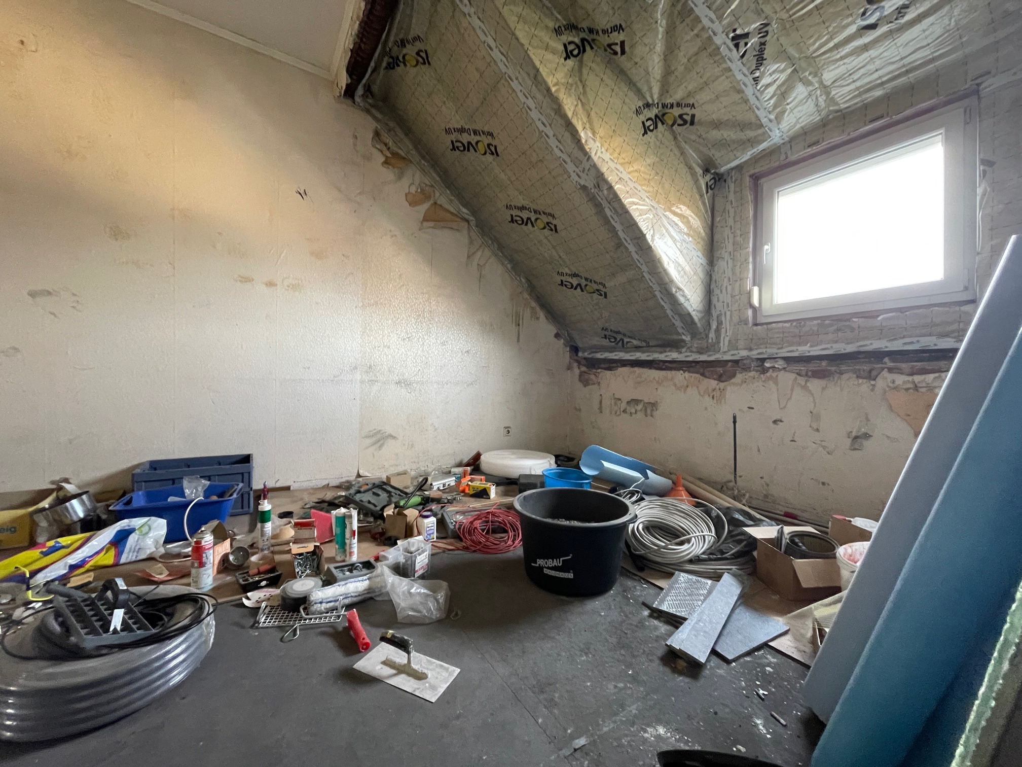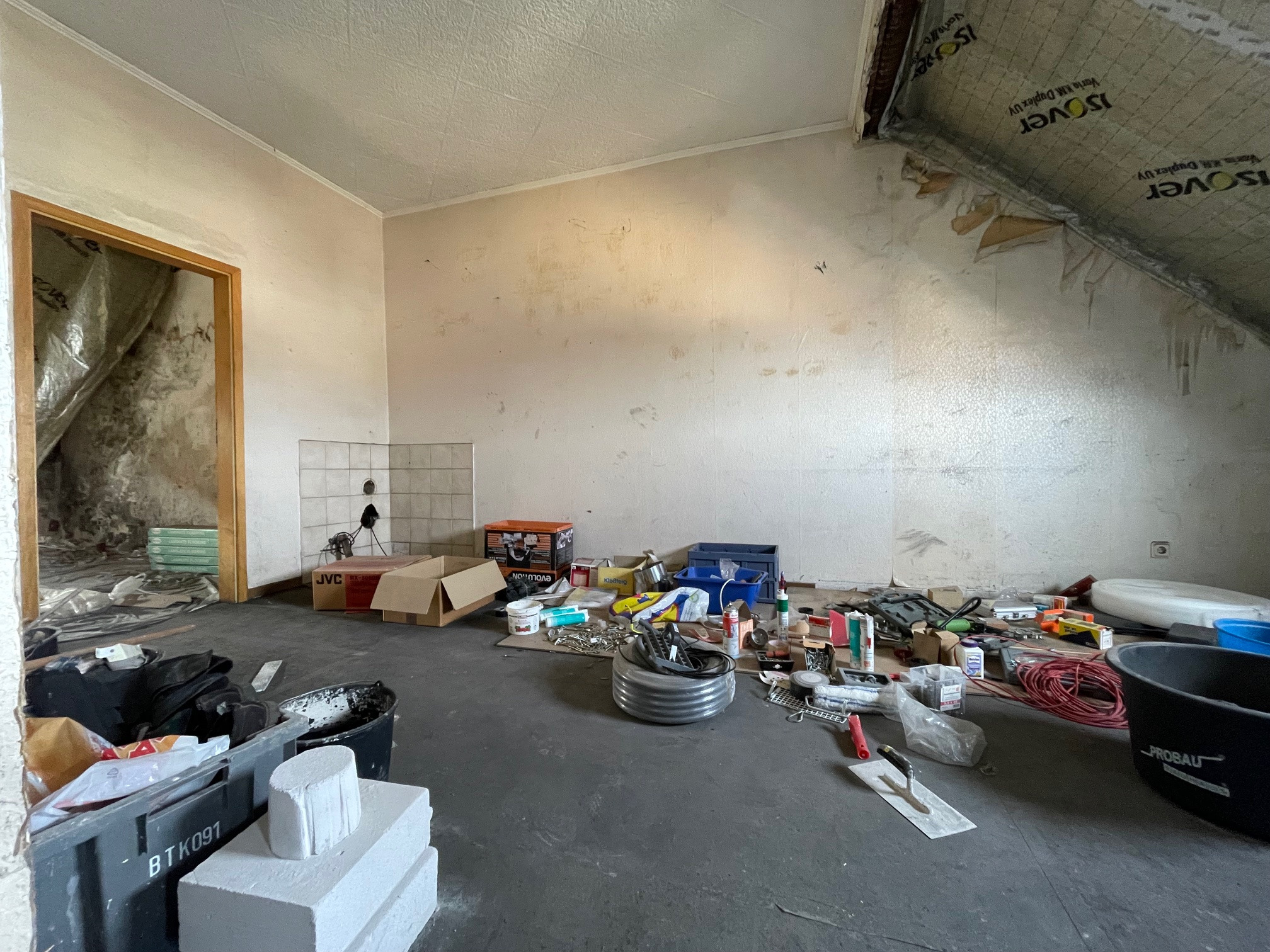 In dieser Wohnung besteht freie Gestaltungsmöglichkeit. Es muss sowohl Strom als auch Heizung neu gelegt werden. Wasser liegt im Bad und in der Küche. Auch besteht hier die Möglichkeit die Raumaufteilung noch zu ändern. Es wurde das Dach angehoben und mit neuen Fenstern in der Gaube ausgestattet. Das Dach wurde erneuert und auch komplett gedämmt. Es befindet sich noch jede Menge Baumaterial in dieser Wohnung. Dieses verbleibt in der Wohnung.